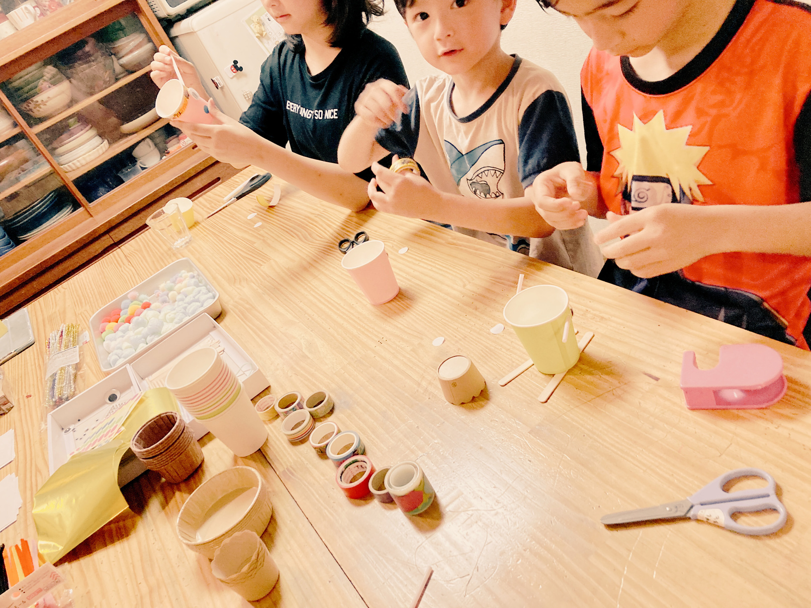 創作の<土台>となるようなコップや紙箱、厚紙や段ボールなどと<装飾>に使えるストローやカラーモール、毛糸などをバランスよく用意してください。